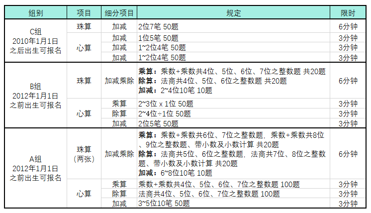 Introduction 活动介绍 珠算已有1800多年的历史,为世界数学体系发展做出了巨大贡献。中国珠算(珠心算)教育全球推广度、覆盖面日益庞大,国际交流机会与日俱增。目前在世界各地有120多个国家都在开展珠心算教学;薪火传承盛典组委会应马来西亚珠心算公会(2015)、北海珠心算学院邀请,兹定于2019年12月组队参赛“2019马来西亚珠心算公开赛”,一展国内珠心算选手的水平,交流分享珠心算文化,领略异国风情,开拓国际视野。 活动主题 “珠联世界 算赢未来” 2020年薪火传承珠算文化国际交流活动-马来西亚站 参与对象 全国珠心算学习者(仅限2019薪火传承盛典奖金获得者、特等奖;或参与水平考核者) 行程安排 活动时间:2019年12月20-24日(5天4晚) 统一出发城市:广州(直飞槟城) 酒店 槟城今旅酒店Hotel Jen Penang(或同级) 升级一晚兰卡威海岛房 行程 12月20日 广州 直飞 马来西亚·槟城 12月21日 集训+【世界文化遗产街】、【寻画】、【升旗山】等 12月22日 比赛+晚上入住 兰卡威 12月23日 兰卡威【东方村】、【高空缆车】、【天空之桥】+庆功宴 12月24日 返程 Introduction 赛事介绍 马来西亚全国珠算珠心算公开赛已历经三十年,是马来西亚乃至珠心算教育业界公认的“民间高手盛会”。近些年,越来越多的学校认识到马来西亚在珠心算教学及训练中的成熟度、严谨性,争相一探究竟,派优秀学员一展身手。薪火传承战队自2017年起两次出征,收获颇丰。 参赛组别(点击看大图) 可在公众号留言,专业老师1对1为您定位孩子能力及组别哦~ “城市杯”直通车 A项总成绩最佳者(7、8、9、10、11、12、国中及公开组心算和珠算的总成绩)及C项总成绩最佳者(5岁以下及6岁心算和珠算的总成绩)公开赛组委会将颁发奖励金RM1,000,并可直送“2020世界城市杯”三算全能竞赛。 薪火传承队员若获得相应组别冠军、季军、亚军可额外获得特设奖金:8800元、5000元、3000元。 Introduction 报名介绍 槟岛不能不离,而离槟岛后其印象竟萦回于脑而不能去。异日如有机会,予必举家而徙之槟榔屿。 ——现代教育家 梁绍文 报名时间 10月10-25日24:00前 (报名可咨询昂立无诀珠心算全国分校;或公众号留言,将有老师专业解答) 报名收费 8800元/选手、7680元/成人。(含广州往返槟城机票;选手可根据优惠权利扣除500元国际活动奖学金) 人数要求 10人成团(含成人、儿童);10位选手额满即止。 备注 1.为满足工作繁忙无法请假的家庭,此次开放选手独立参与方式,且总部将为无家长(成人)陪同的选手,配备3:1带队老师数量(即3位学员由一名专职老师全程照顾)。 2.选手费用含比赛项目费用:100马币(含一组别看珠算+看心算) 签证说明 ·可协助代办签证,费用另付;签证有效期3个月,停留期30天) ·电子签证(近3个月没有做过马来签证):200元/人。材料:护照首页+电子版照片即可。 ·贴纸签:310元/人。护照原件+2张近6个月内拍摄的白底两寸(3.5cm×4.5cm)相片(必须要白底),16岁以下儿童还需要出生证明复印件。